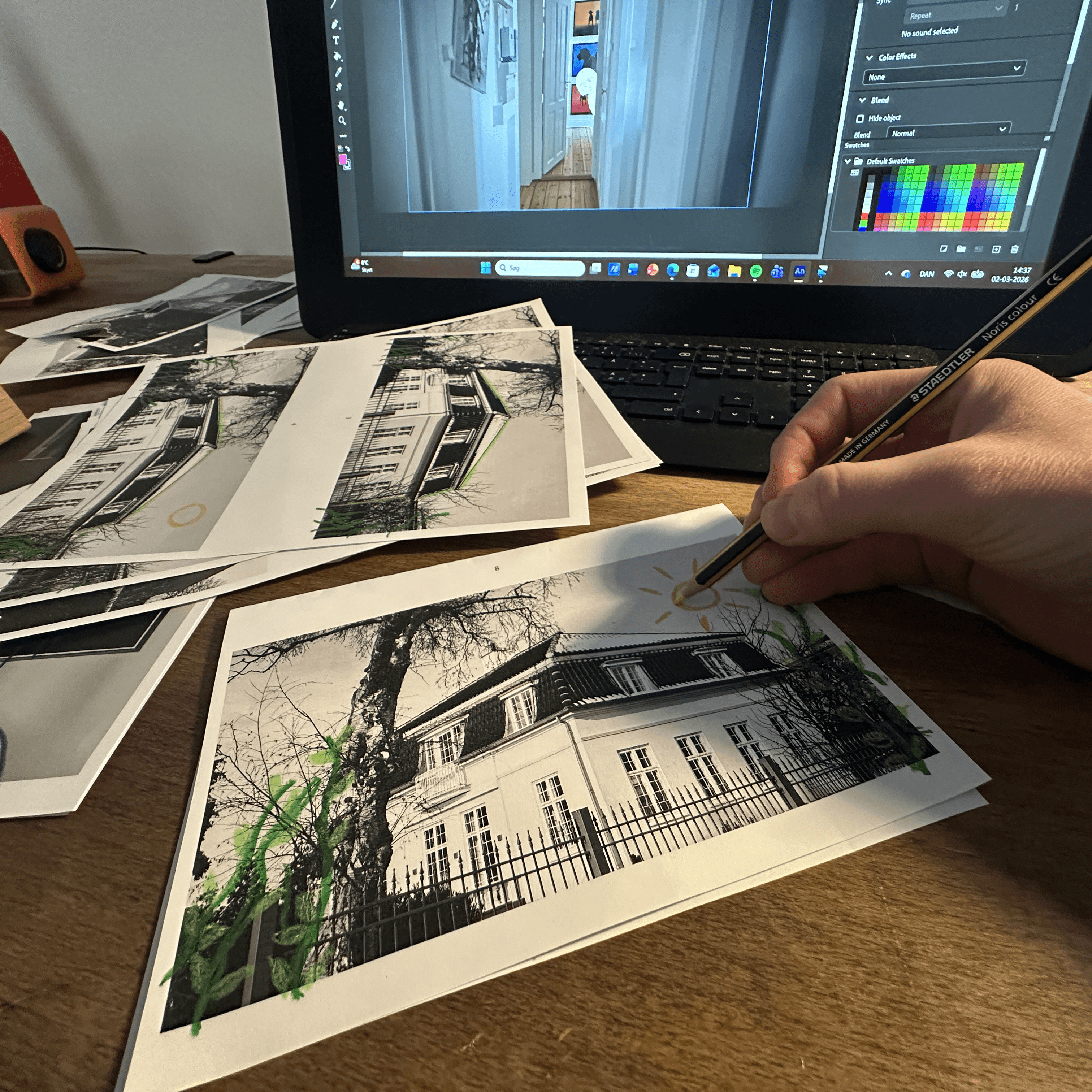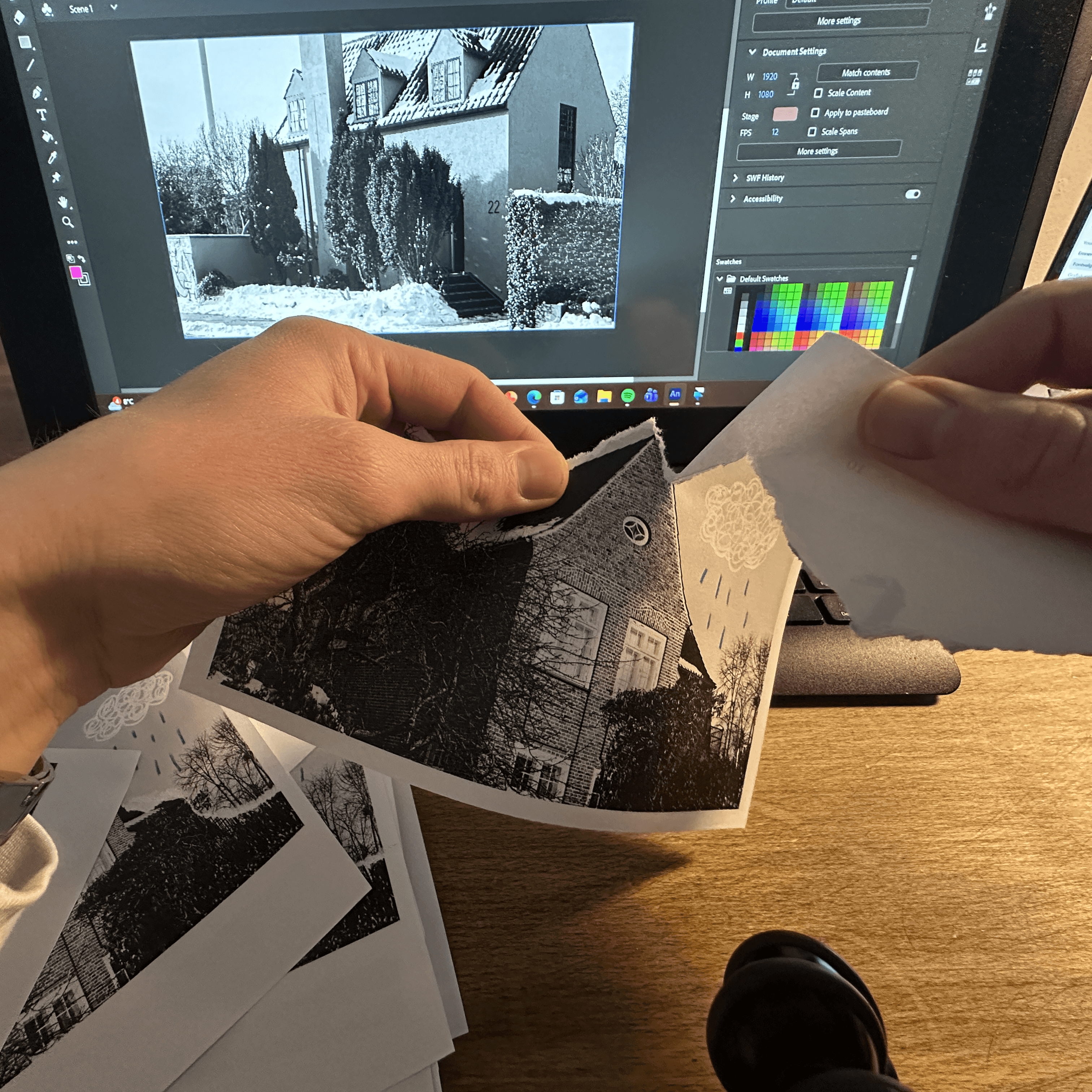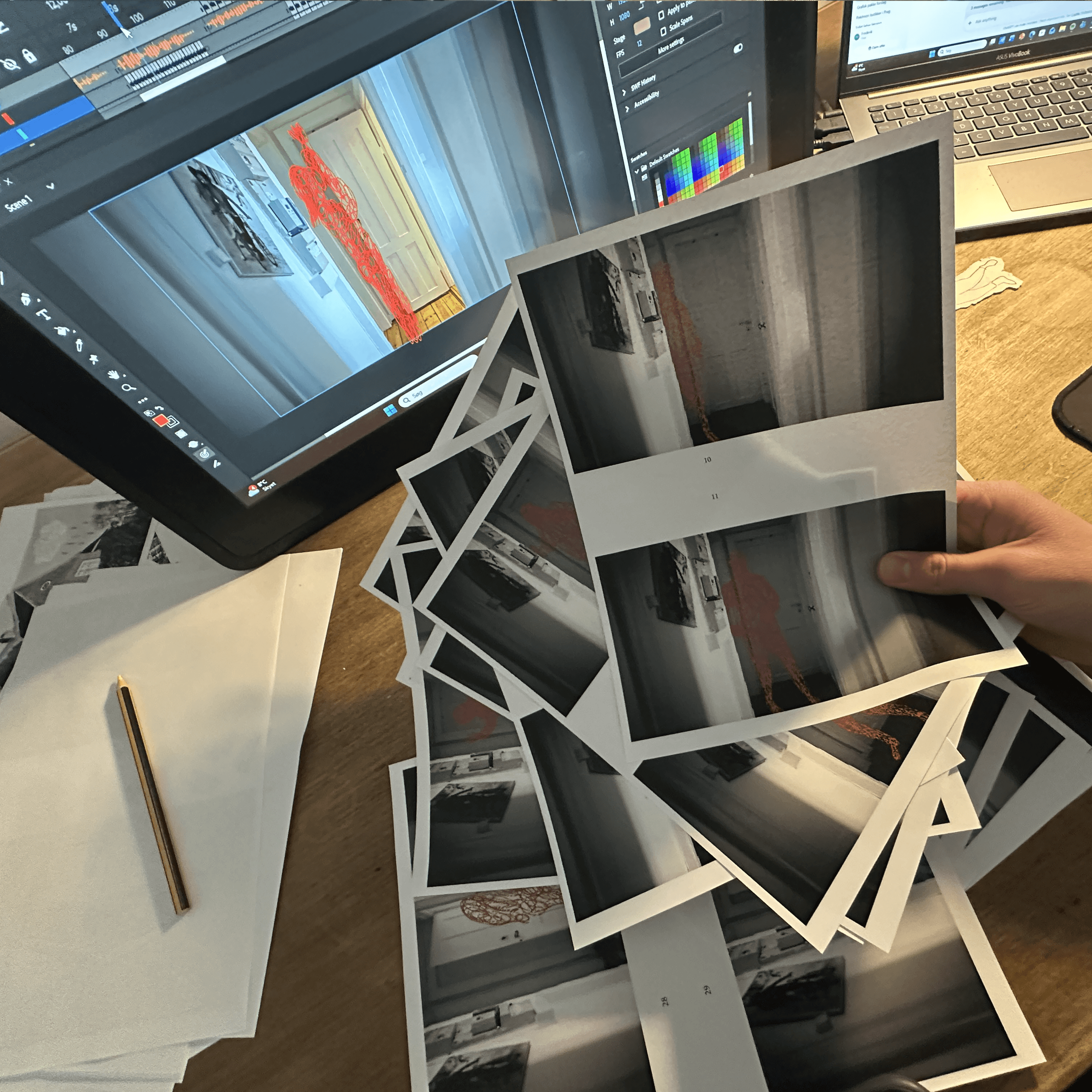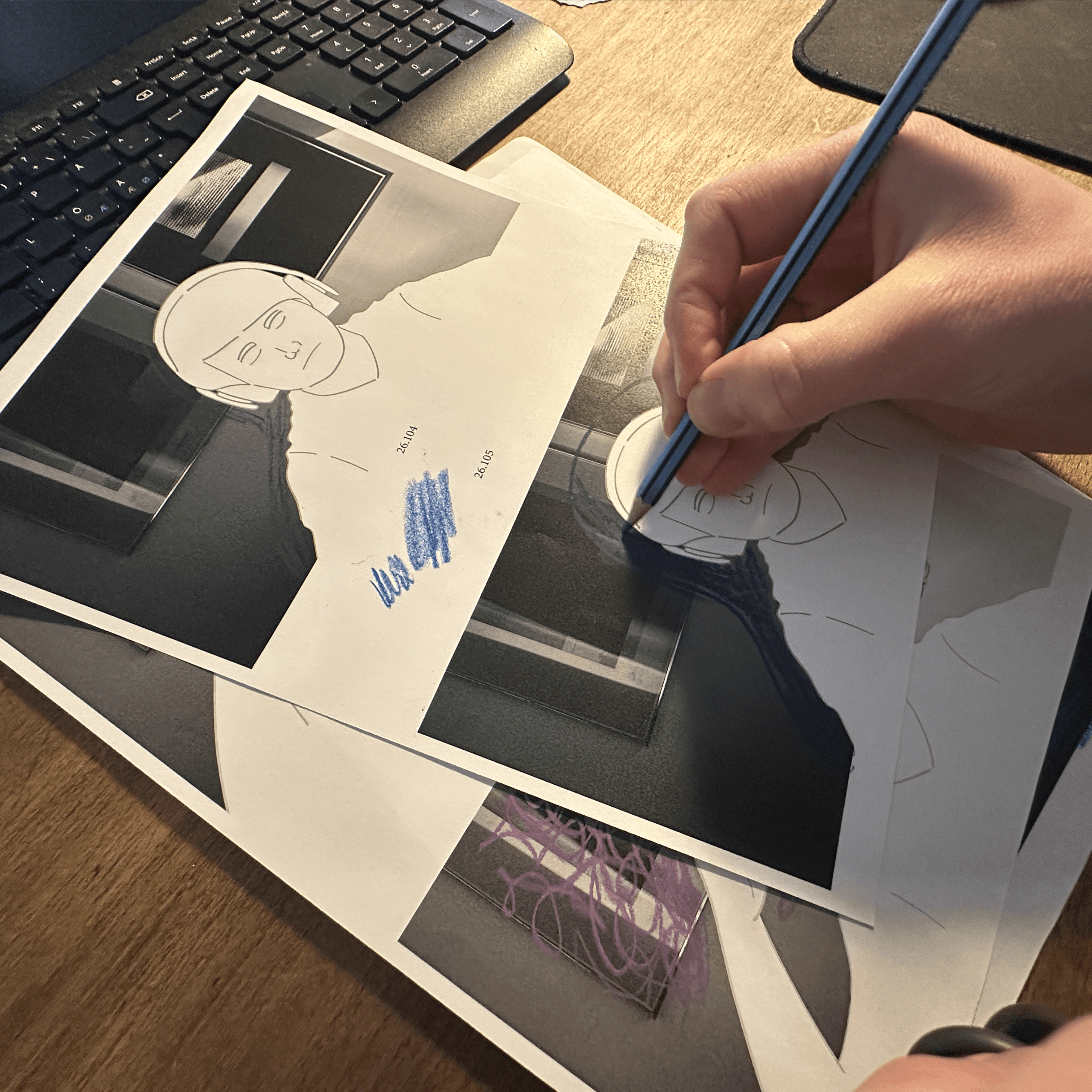 Med frie rammer udviklede jeg et visuelt koncept for både interviewsekvenser (synk) og erindringer, hvor minderne visualiseres gennem mixed media.